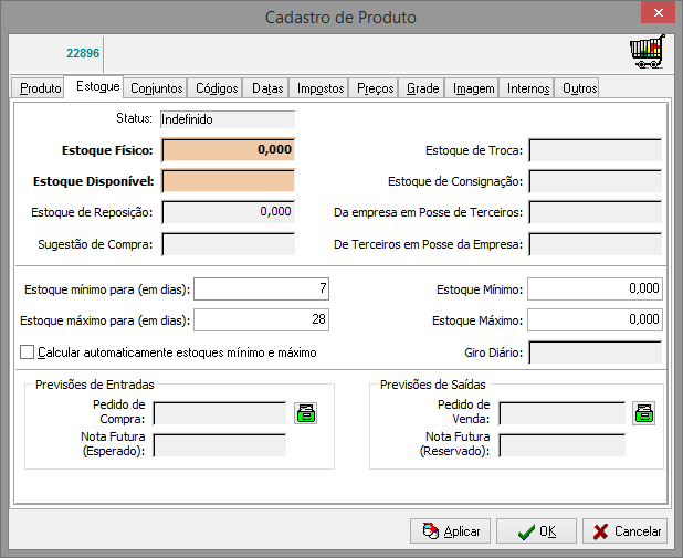 Estoque de Reposição: Campos destinado ao estoque de reposição do produto, quantidade em que deve ser efetuada a compra ao ser atingida.