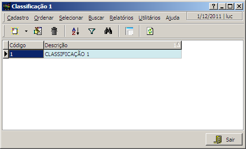 Nesta interface o usuário terá acesso ao cadastro das Classificações 1, que servirão para classificar os produtos.