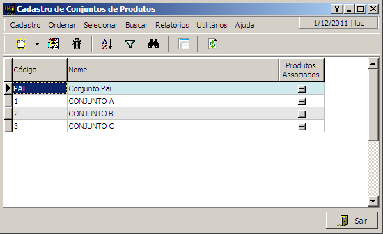 Nesta interface o usuário terá acesso ao cadastro dos Conjuntos de produtos, que servirão para agrupar os Produtos.