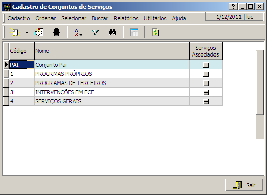 Nesta interface o usuário terá acesso ao cadastro dos Conjuntos de serviços, que servirão para agrupar os serviços.