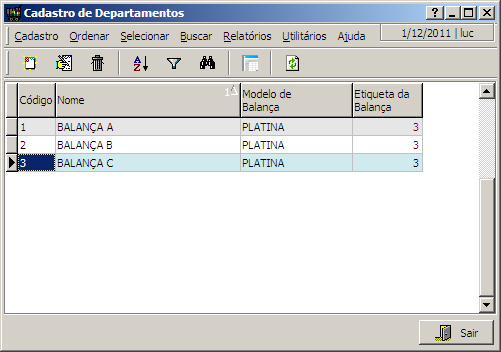 Nesta interface o usuário terá acesso ao cadastro dos departamentos das balanças. Estes departamentos deverão estar igual aos que existem no programa SAB, pois quando o sistema for gerar os arquivos para integração com o SAB, está informação será enviada para o SAB.