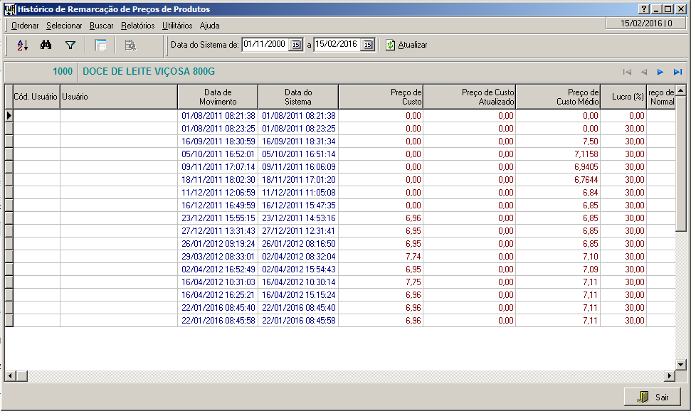 Nesta interface o usuário terá acesso aos históricos de remarcações de preços dos produtos.