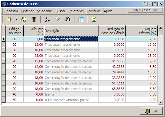 Nesta interface o usuário terá acesso ao cadastro dos ICMS que serão utilizados pelo sistema.