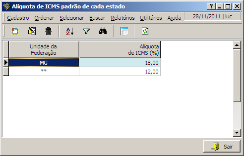 Nesta interface é possível visualizar e alterar as alíquotas padrões de ICMS adotadas em cada Unidade da Federação, estes ICMS padrões poderão ser usados no cadastro de produtos, agilizando a inserção de dados no cadastro.
