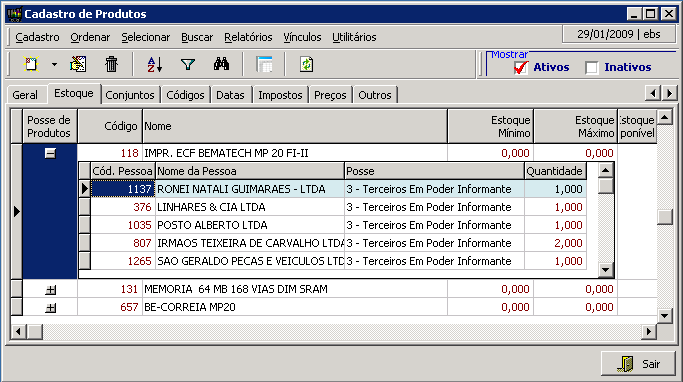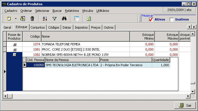 Ao PROCESSAR esta NF, o sistema não altera o Estoque Físico, mas irá (inserir ou somar) dados na tabela de Posse de Produtos como mostra o exemplo a seguir: