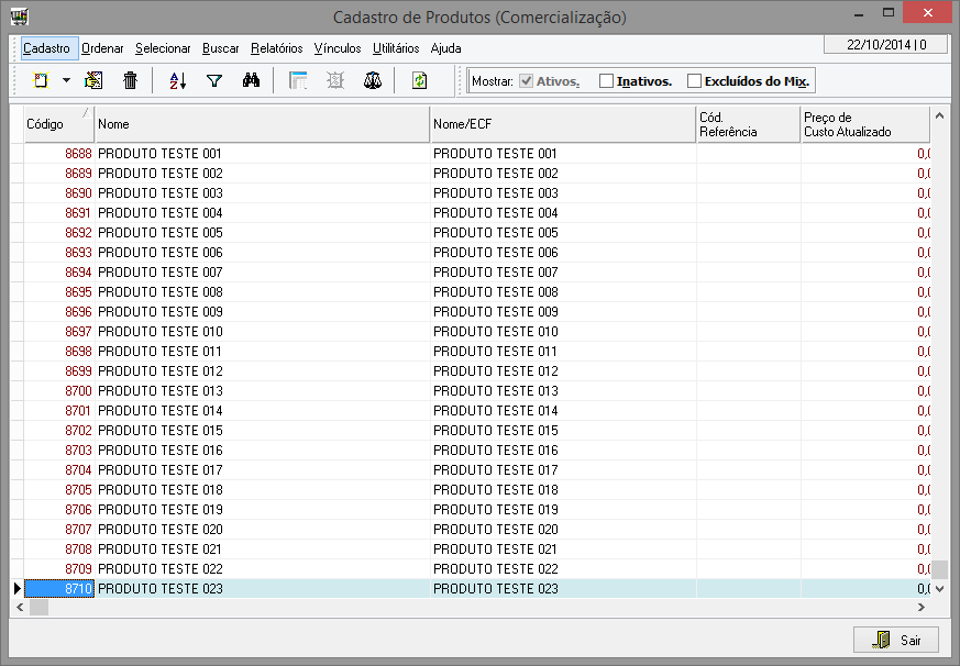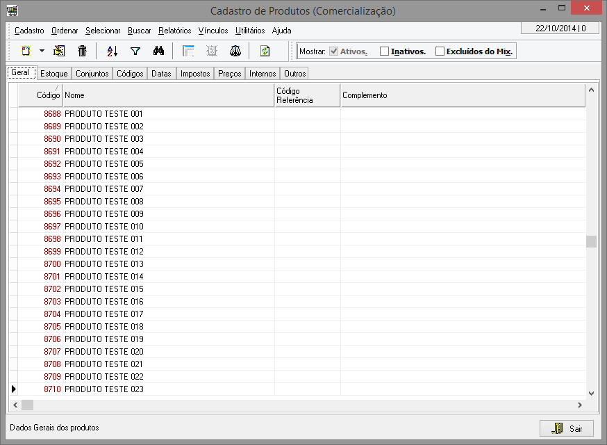 Interface simplificada do cadastro de produtos. Esta interface possui apenas algumas das diversas informações dos produtos.