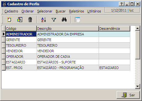 Nesta interface o usuário terá acesso ao cadastro de perfis dos usuários, estes perfis, servem para se dar níveis de acessos aos usuários, a determinadas partes dos sistemas do Thotau.
