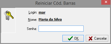 Reiniciar o código de barras: Para reiniciar o código de barras, é necessário digitar o campo Senha, se a mesma for correta para o usuário, um código de barras será gerado para o usuário.