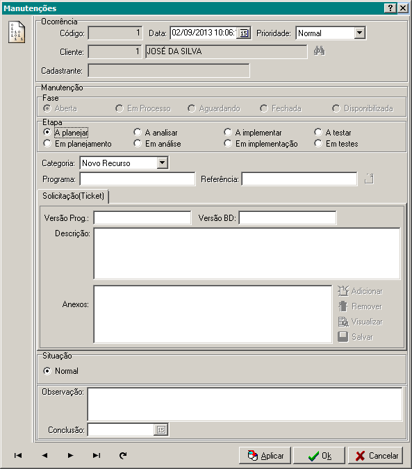 Definição de campos da manutenção