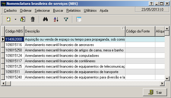 Nesta interface o usuário terá acesso ao cadastro de nomenclatura brasileira de serviços. O sistema THOTAU já vem com as principais nomenclaturas cadastradas mas o usuário poderá cadastrar novas, de acordo com as suas necessidades.
