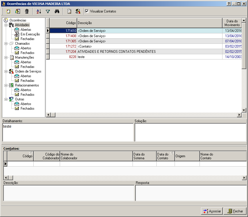 Interface que permite o usuário associar uma ocorrênica a um ou mais contatos e/ou cadastrar uma nova ocorrência.