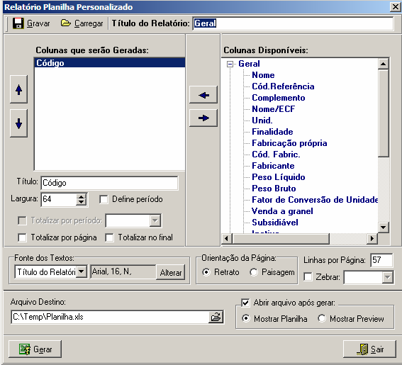 Formulário destinado à criação de um relatório personalizado, de acordo com as necessidades e especificações do usuário. O relatório será criado no formato de uma planilha.