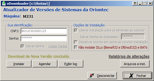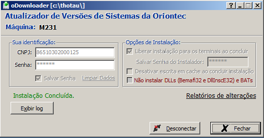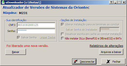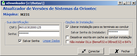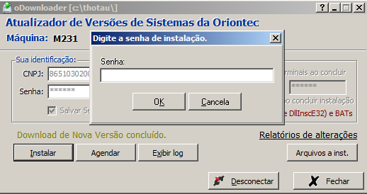 - Senha do instalador(Apenas para oDownloader que utiliza o CNPJ da Oriontec): Senha necessária para ativar a opção de