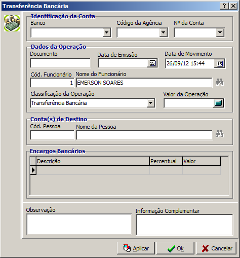 Deverá preencher o banco, agência e conta de origem do valor, número do recibo da transferência, data de emissão, data de movimentação, código do funcionário que efetuou a transferência, classificar a operação como "Transferência", colocar o valor da operação. Ao efetivar deve ser escolhida a conta bancária de origem no plano de contas e a conta bancária de destino.