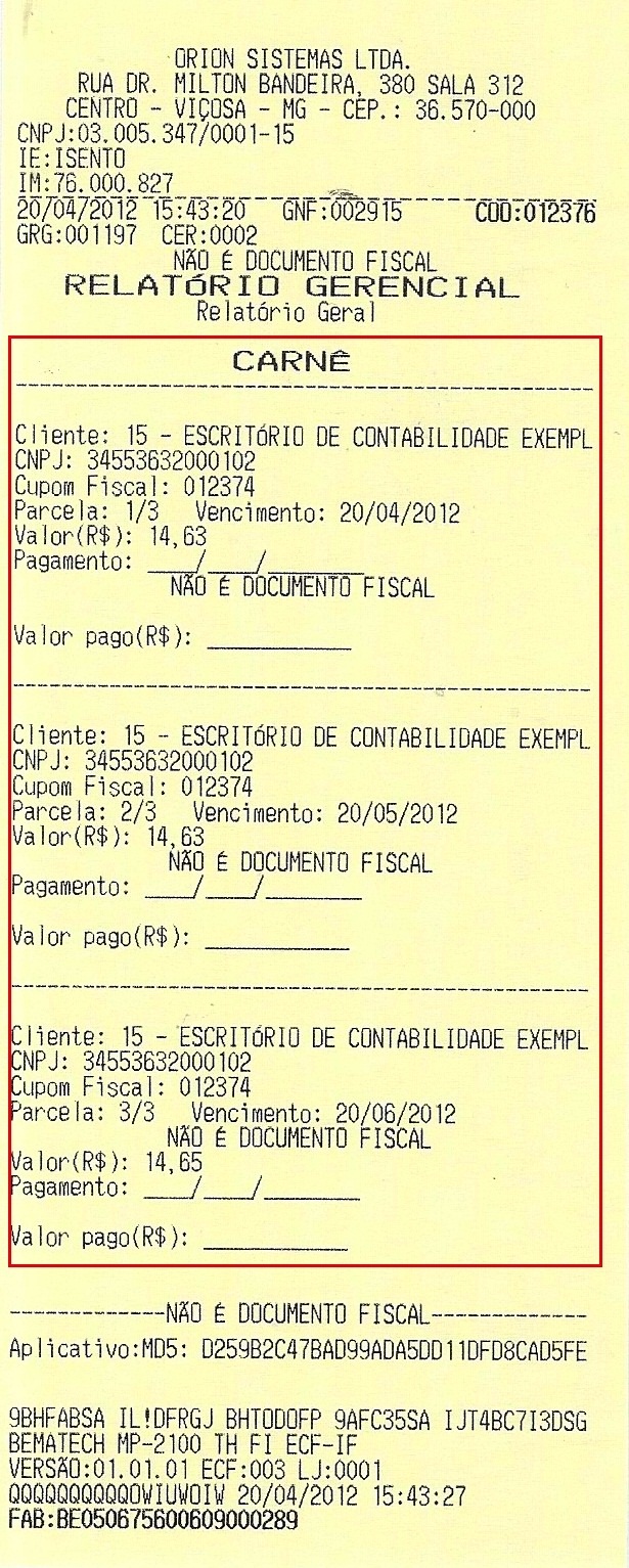 Carnê impresso no ECF referente a uma venda parcelada em 2 vezes