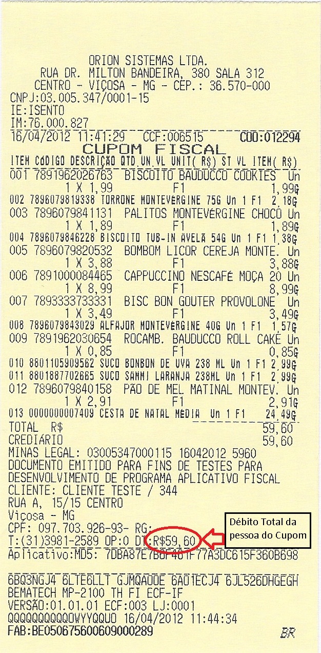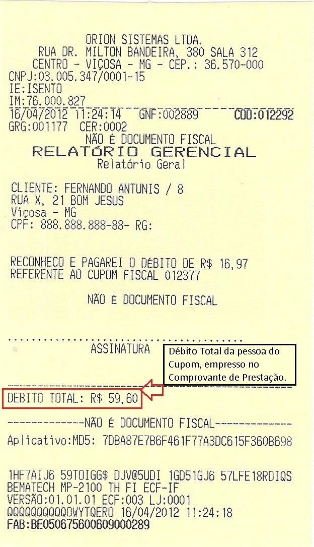 Cupom Fiscal emitido com o Débito Total (DT) da pessoa