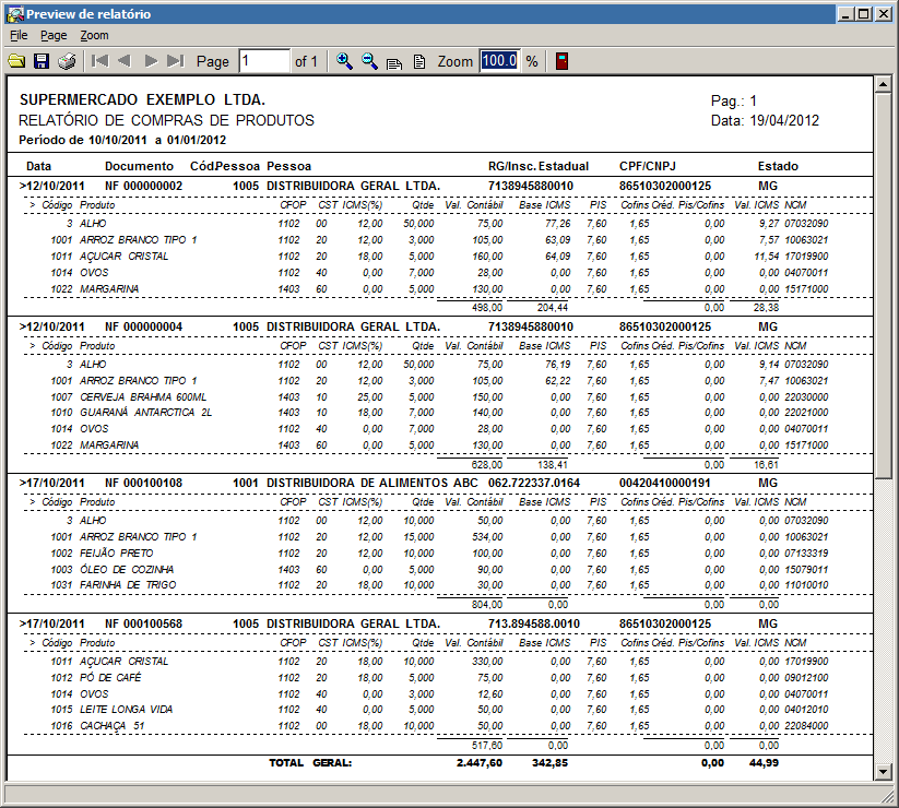 Relatório fiscal de movimentações de entradas, por período (Data de Movimento). Exibe apenas dados de documentos processados, impressos e produtos com finalidade comercialização. Veja figura abaixo.