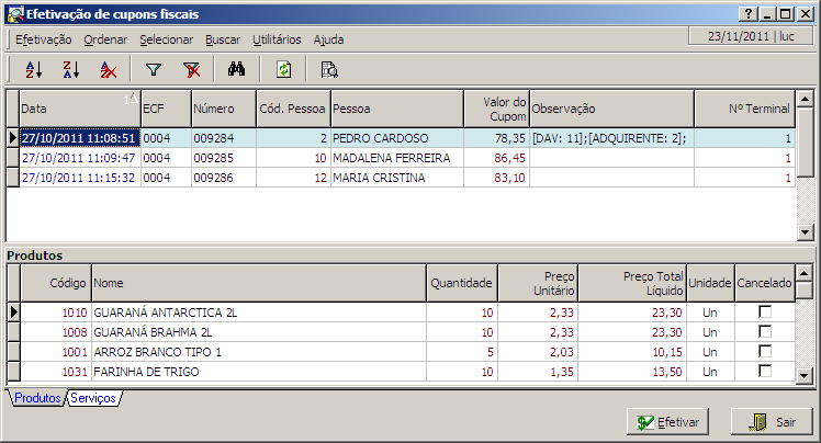 Esta interface exibe todos os cupons fiscais que ainda não foram efetivados e permite a efetivação dos mesmos. Ao clicar no botão "Efetivar" o sistema fará a efetivação de todos os cupons fiscais exibidos na tabela de forma sequencial.