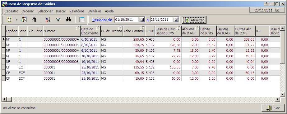 Esta interface permite a geração do livro de registro de saídas que é composto pelas notas fiscais de saída e cupons fiscais registrados no sistema.