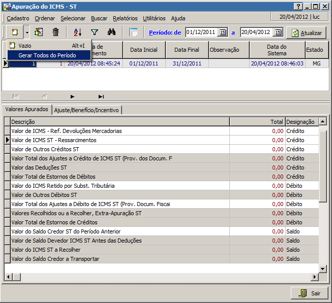 Esta interface permite fazer a Apuração de ICMS ST da empresa com base nos registros que obtiveram crédito e débito de Substituição Tributária separado por estado. Pode ser gerado separadamente inserindo "Cadastro/Novo" ou inserir automaticamente todos os estados na opção "Cadastro/Novo/Gerar Todos do Período".