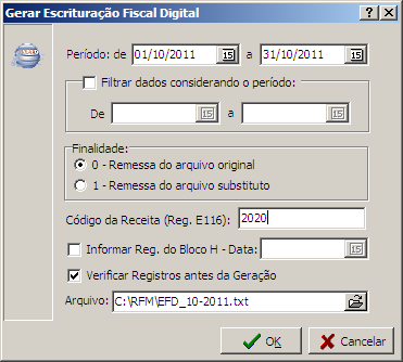 Informe o período e marque as opções desejadas, em seguida clique no botão OK para que os registros sejam gerados.