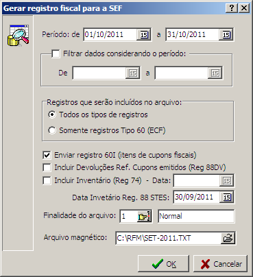 Informe o período para o qual se deseja emitir o registro fiscal magnético e marque as opções desejadas, em seguida clique no botão OK.