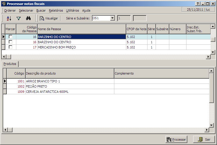 Na grade superior são exibidas todas as notas fiscais que ainda não foram processadas, ao clicar sobre uma nota na grade inferior serão exibidos os itens da nota. Para processar a nota marque-a utilizando para isso a coluna Marcar, e em seguida clique no botão Processar.