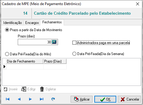 - Data Pré-Fixada(Dia do Mês): Tabela responsável pelo armazenamento de informações sobre datas de fechamento de operações TEF.