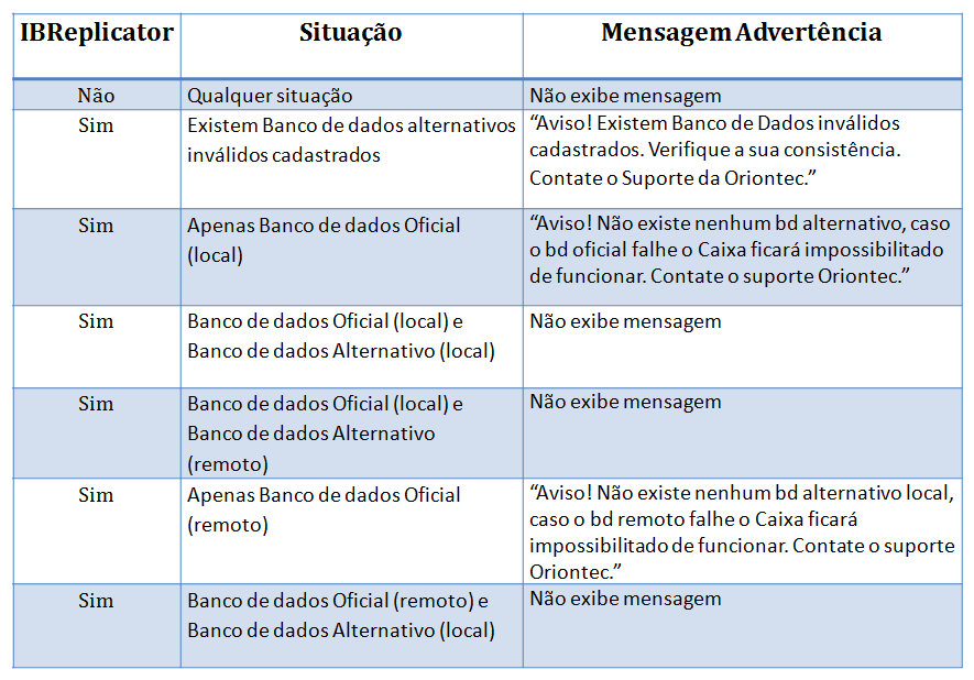 Existem algumas situações em que o CAIXA adverte ao usuário sobre possíveis problemas que poderão ocorrer devido a implantação de estruturas físicas ou de Bancos de Dados mau planejadas. A seguinte tabela explica detalhadamente estas situações: