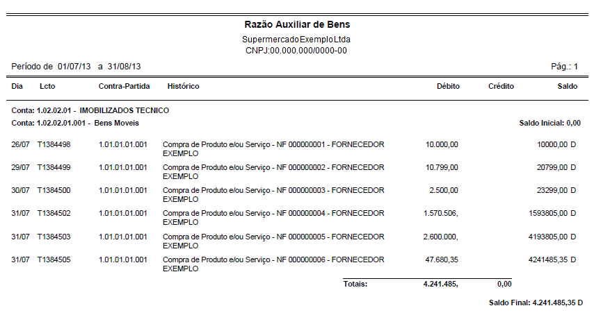 Exemplo de impressão do relatório Razão Auxiliar de Bens
