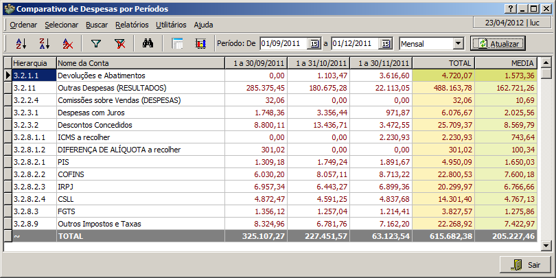 No menu Utilitários, podemos escolher as opções Total, Média, Total por Período para serem exibidas também no comparativo.
