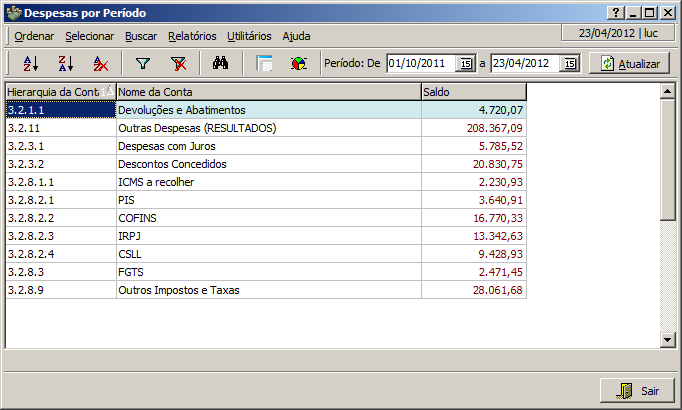 Nesta interface é possível visualizar informações referentes ao saldo das contas de despesas para um determinado período.