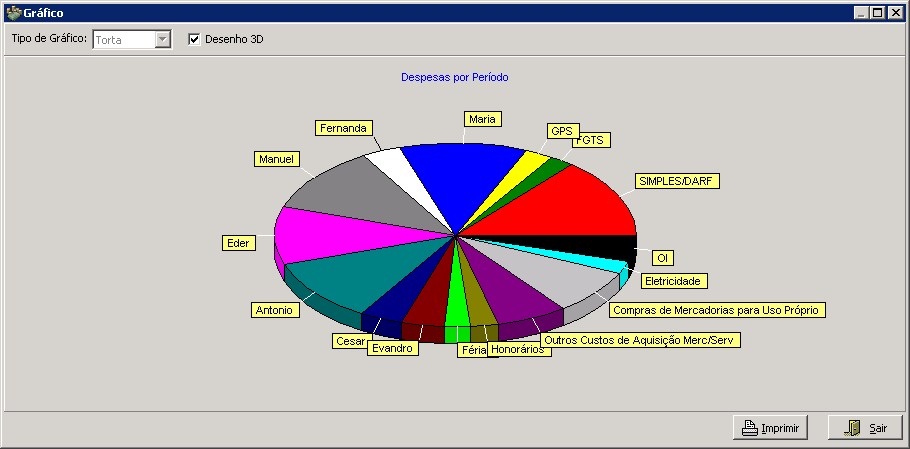 Nesta interface, temos também a representação gráfica para as despesas do período. A partir da representação gráfica, os gestores poderão ter uma idéia melhor de quanto cada despesa está representando do total de despesas do período, facilitando a análise das informações.