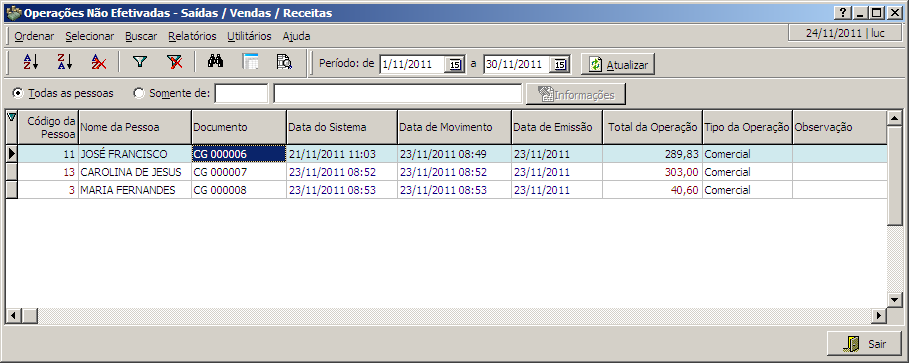 Nesta interface é possível visualizar as operações de entrada / saída pendentes, ou seja, que ainda não foram efetivadas.