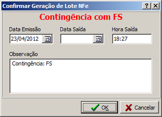 A justificativa deverá conter no mínimo 15 caracteres. O usuário só deve informá-la no primeiro lote que for emitido em contingência FS.