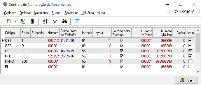Nesta interface são cadastrados os controles de numeração de documentos usados pelo sistema.
