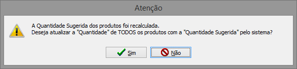 Todos os produtos do pedido com a Quantidade Sugerida pelo Sistema. Ao solicitar essa funcionalidade o sistema exibe a seguinte mensagem: