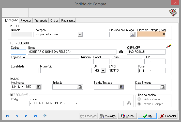 Nesta guia devem ser informados os dados básicos do pedido como Operação,