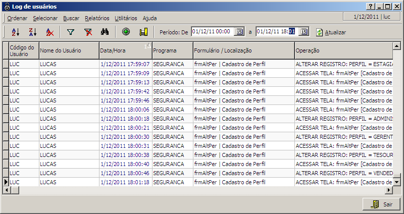 Nesta interface o usuário terá acesso aos logs de Usuários. Nestes logs estăo gravadas todas as operaçőes efetuadas pelos usuários nos módulos do THOTAU.