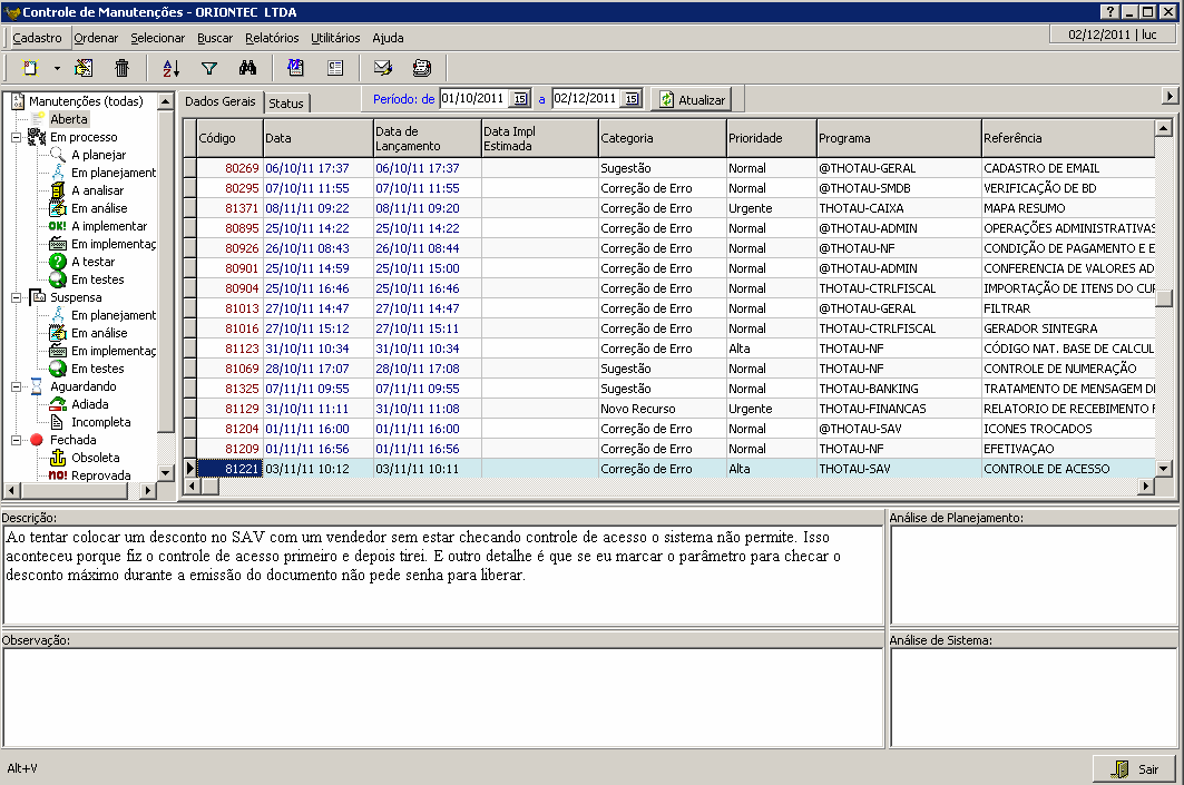 funcionalidades deverão ser criadas, uma manutenção deverá ser