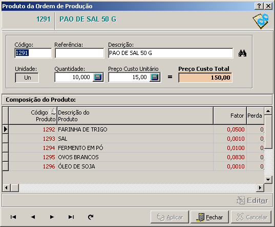 Nesta interface são registrados os produtos que fazem parte da Ordem de Produção.