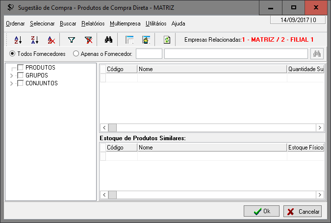 Quando o sistema estiver configurado como multiempresa, a interface de Sugestão de Compra exibirá uma informação extra: